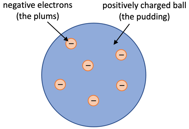 Thirdly, we have JJ Thomson and in 1897 he discovered the electron which is the negatively charged sub-atomic particle. He demonstrated that atoms were not indivisible but are made of smaller negatively charged particles. He conducted experiments with cathode rays to show these smaller sub-atomic particles, and they were much lighter than any other atom in the world. His experiment used cathode rays, a beam of light in a vacuum tube caused by high voltage. By observing the cathode rays deflect towards a positive electric plate and away from a negative one, Thomson concluded they consisted of negatively charged particles. Based on his discovery, Thomson proposed the plum pudding model, where negatively charged electrons are inside a sphere of positive charge. And his model is named after plum pudding because it looked like one, the electrons were the plums inside, and the pudding itself is the positively charged sphere. And this is how it looked: